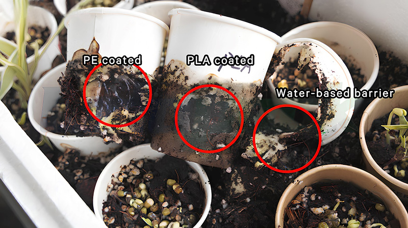 Post CCXLV dies, in aqueum dextra charta calicem habebat omnino, in fibris de PLO fuerat degradatus, in film de PLA hadruptured, et film de PE ad basically integrum.